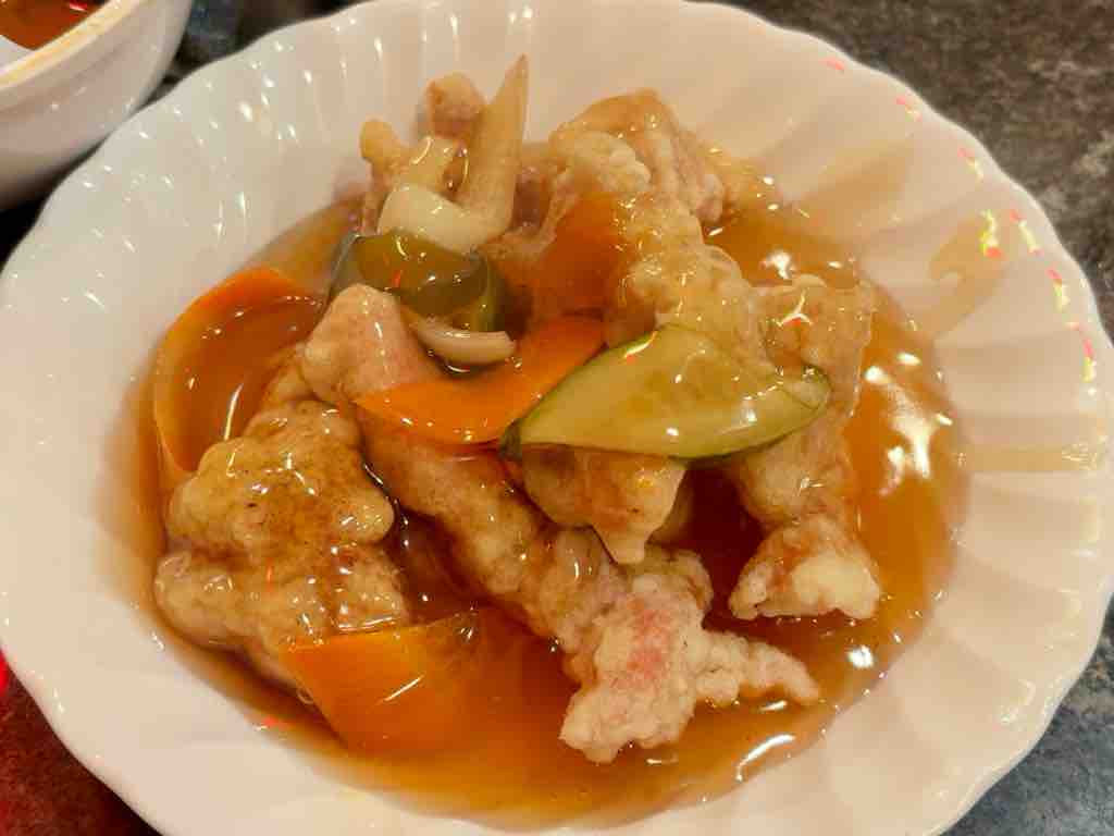 どちらの麺も太麺ストレートでつるんとしています韓国風酢豚は、豚肉をフリットにして甘酢餡を絡めたもの、フリットがなかなか面白い食感です