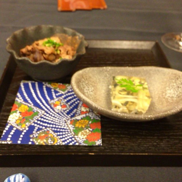 御食事は、先ずはふぐの煮こごり、牛肉のすき焼きからスタートです。
