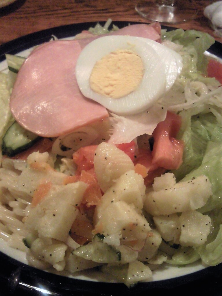 マヨネーズ系のドレッシングでしっかりと和えてありますが、表面はレタス、キュウリ、オニオン、トマト、ジャガイモハム、ゆで玉子。この盛り上がりの下はすべてスパゲッティw