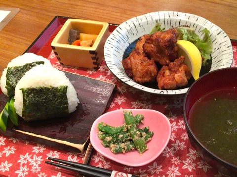 塩麹唐揚げが6個、小鉢は、煮物とインゲン胡麻和え。小さめの塩むすびが2個。お吸い物はとろろ昆布。男性では物足らない量ですが、この時間に食べる事を考えれば、丁度良い量ですね。