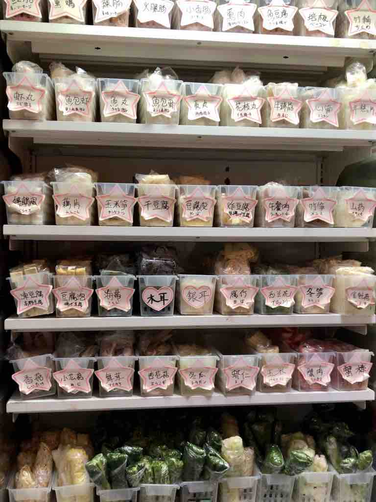 上海のお店と同じように、プラスティックの籠に、食べたいトッピングを選んで入れるシステム。