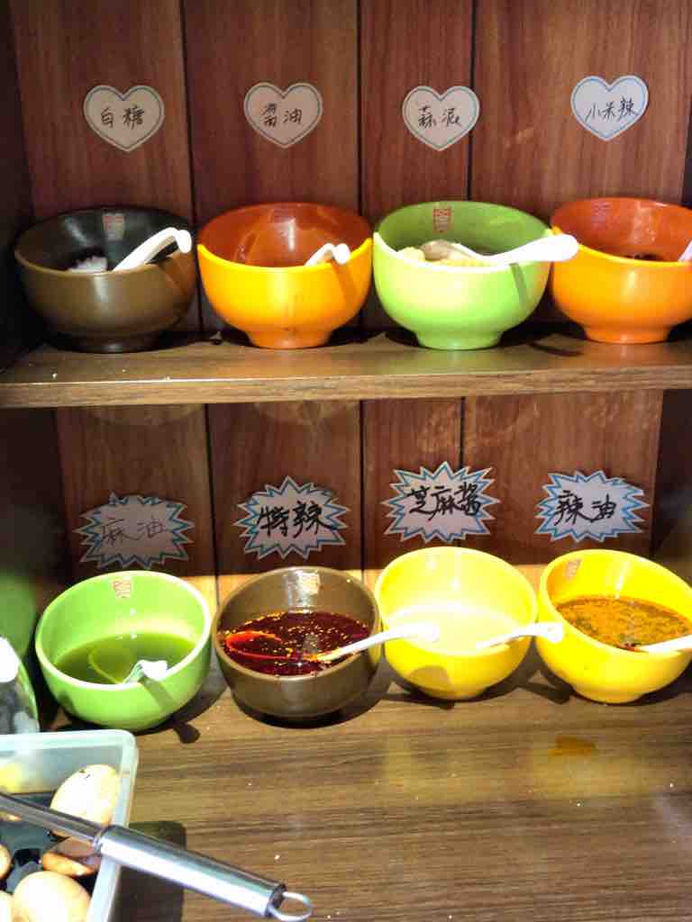玉米面、春雨、板春雨、牛筋雨の4種類。玉米面(トウモロコシ麺)でお願いします。中辛でと言ったら「辛さは自分で作る」と横の調味料の棚を指します。