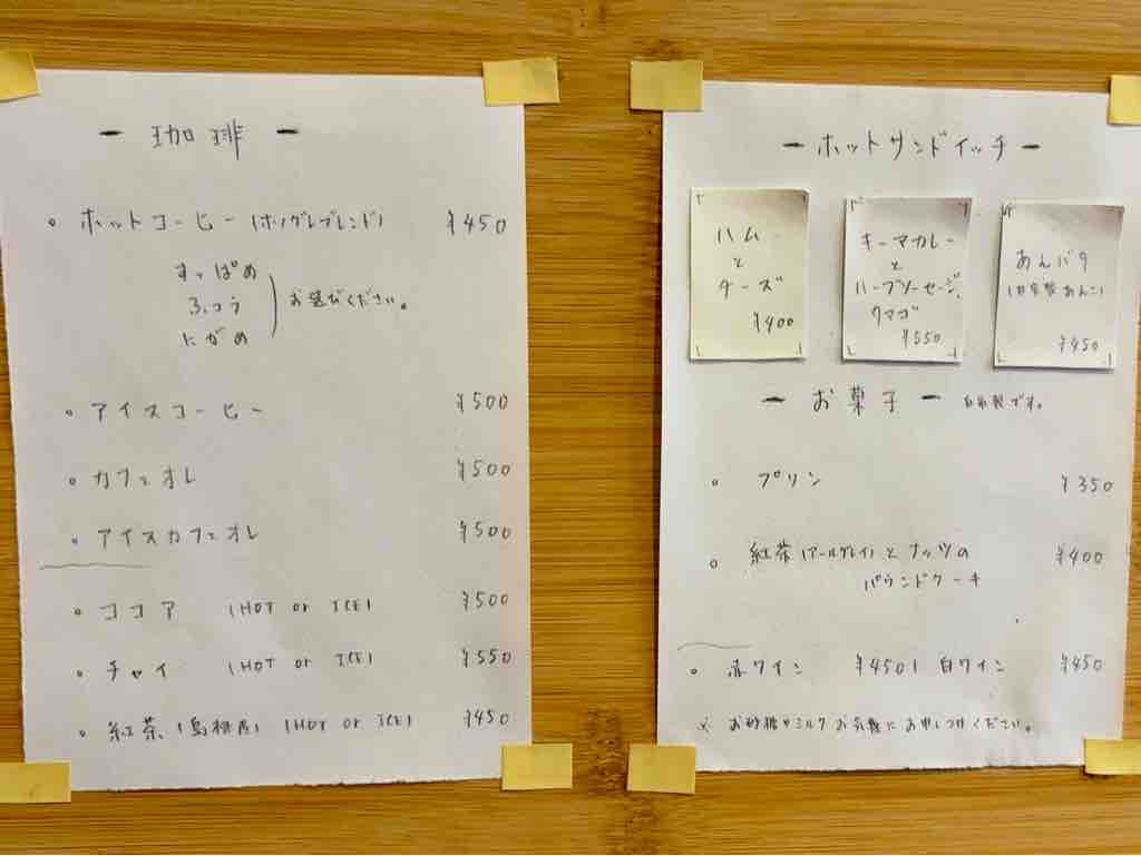 ガラス引き戸を開けて、誰もいないカウンターの奥に着席手書きのメニューが可愛いですね、細かく細い文字なので、爺さんにはちと辛いw