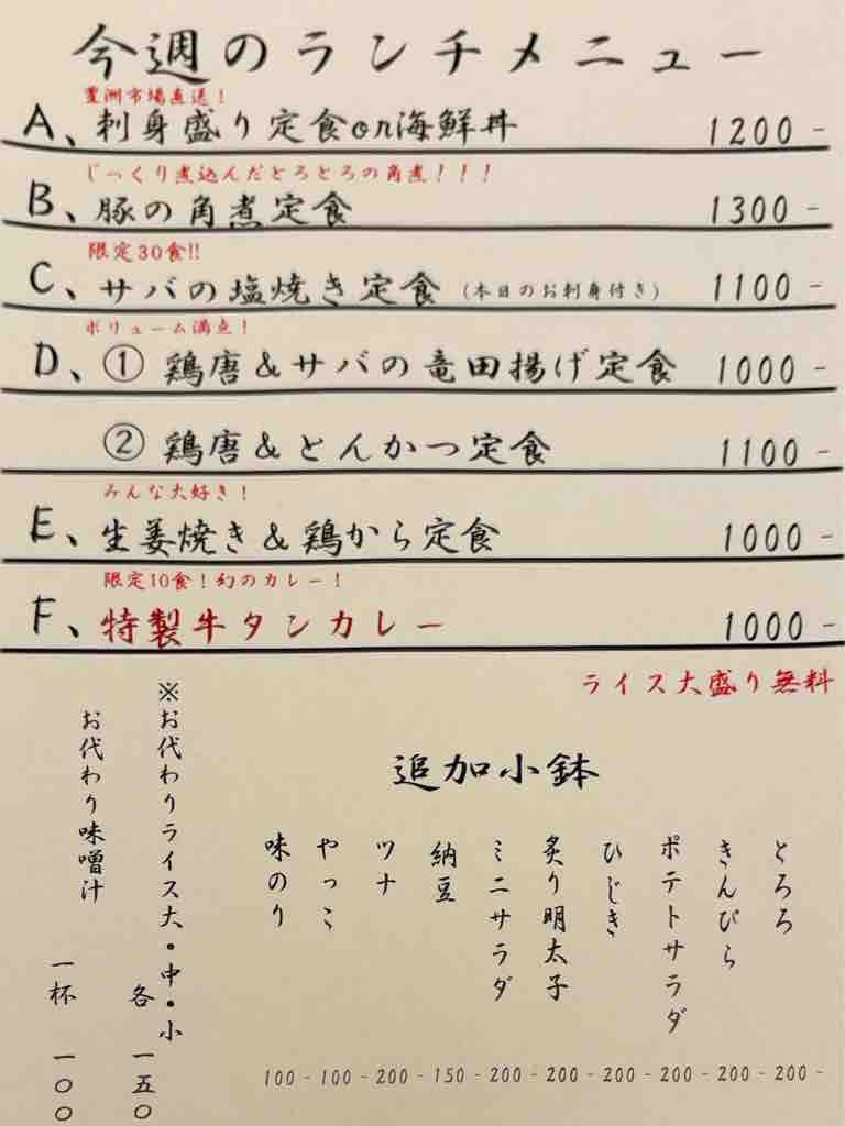 刺身定食にしようかとも思いましたが結構寒いので、Dの鶏唐&サバの竜田揚げ定食 1000円をお願いします