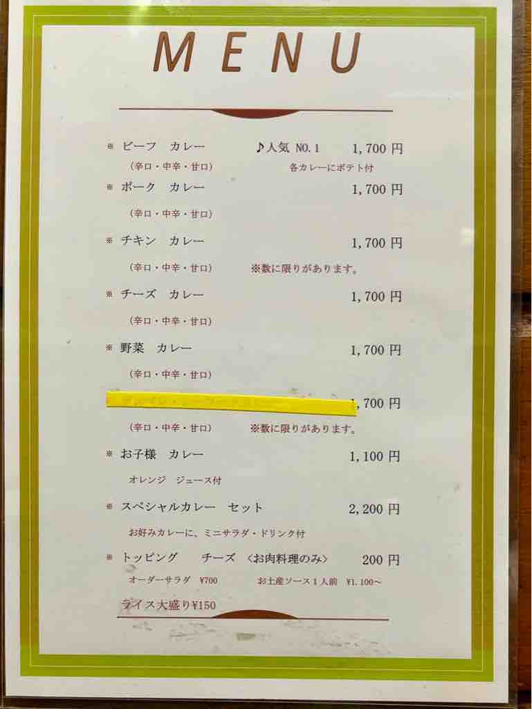 カウンター5席に4人掛け4卓、カウンターに座ろうとしたらテーブルにどうぞと勧められましたメニューは、ビーフ、ポーク、チキン、チーズ、野菜、(シーフードは消されてました)、お子様、スペシャルカレーセット