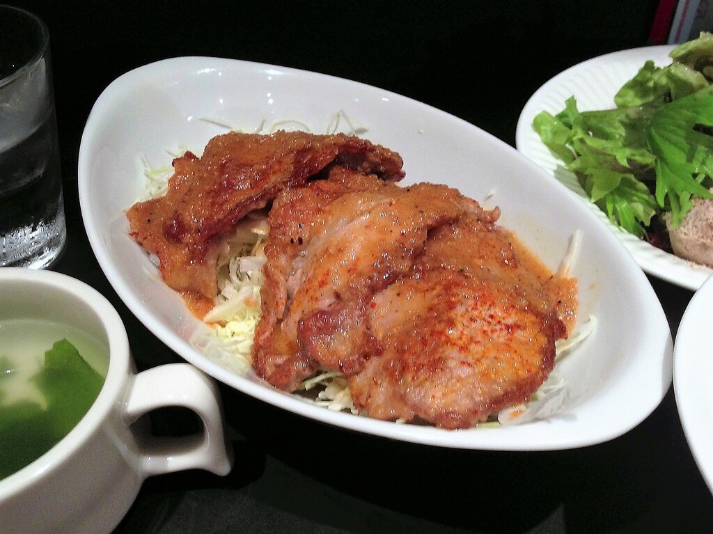 豚の肩ロース肉を焼き上げ、特製オニオン醤油ソースが絡まっています。