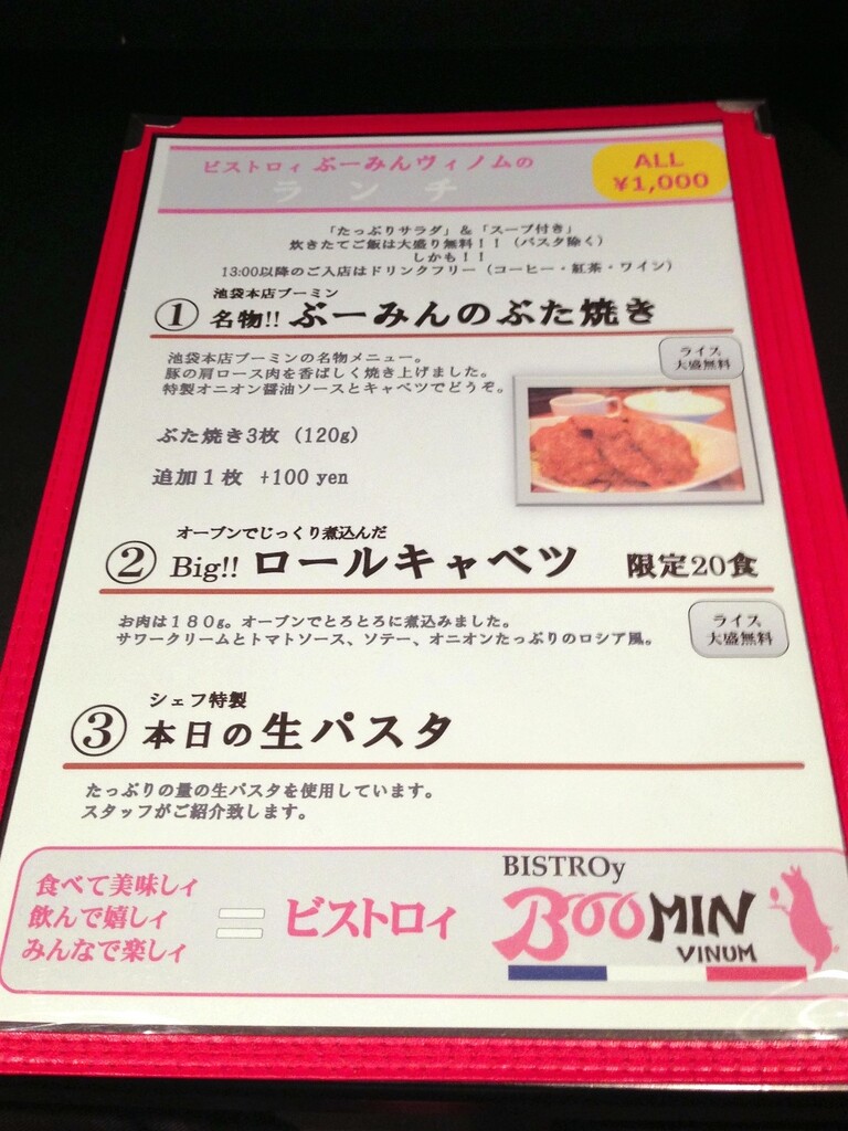 ランチは、名物のぶた焼き、ロールキャベツ、パスタの3種類。どれも1000円。13時以降はドリンクも付きます。