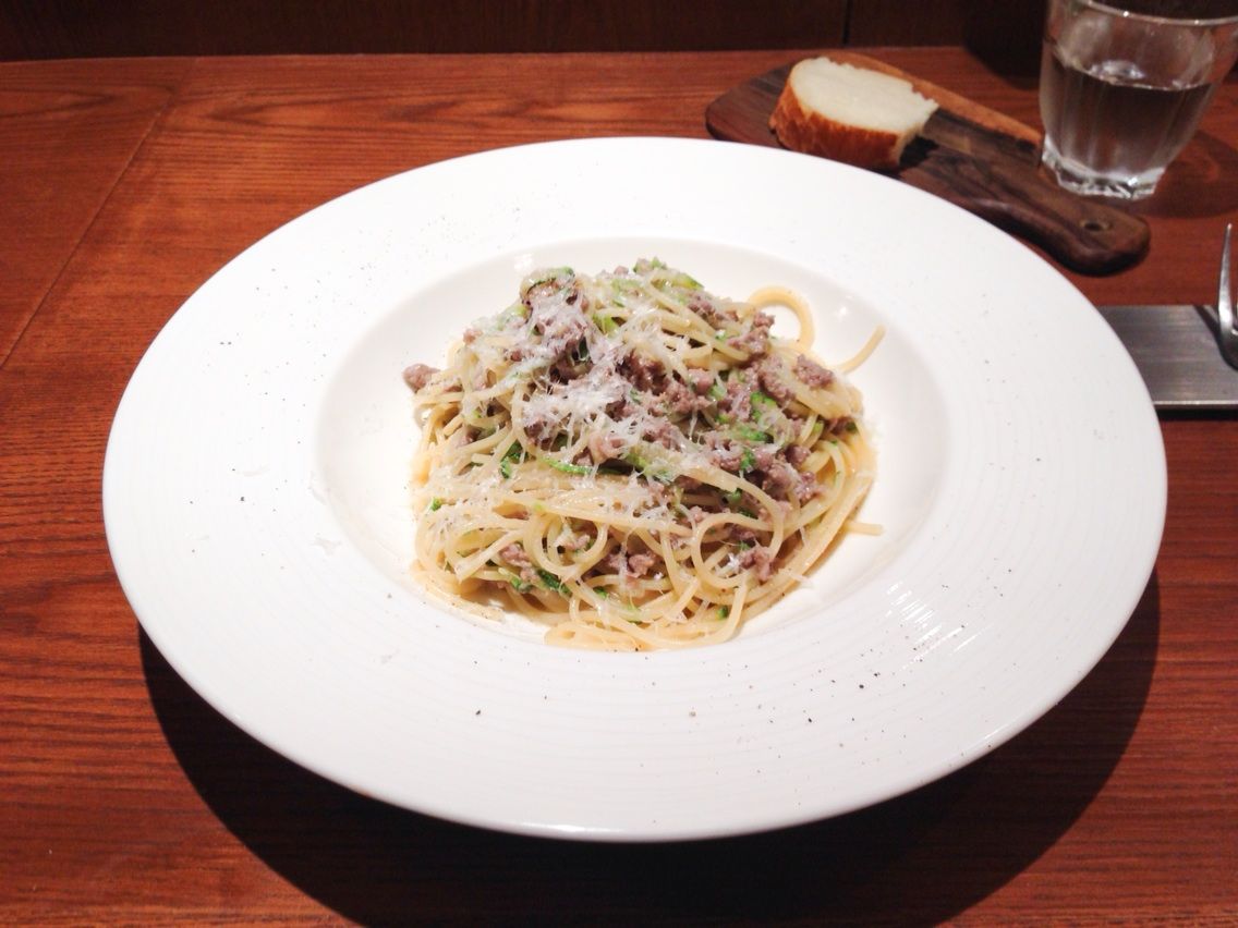 『豚サルシッチャとズッキーニ、ミルキーなペコリーノチーズをかけて』サラダとパンが付いて1000円になりましたね。 粗挽きの豚肉が美味しいデスね。ズッキーニは、千切りにされて、アクセントになっています。