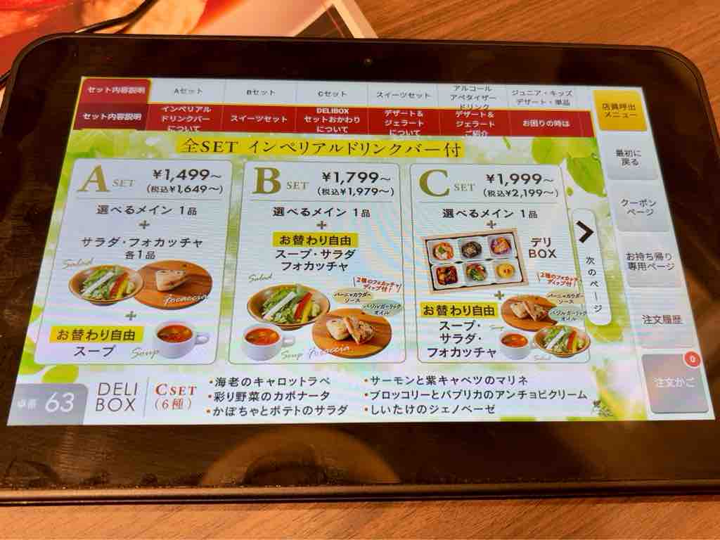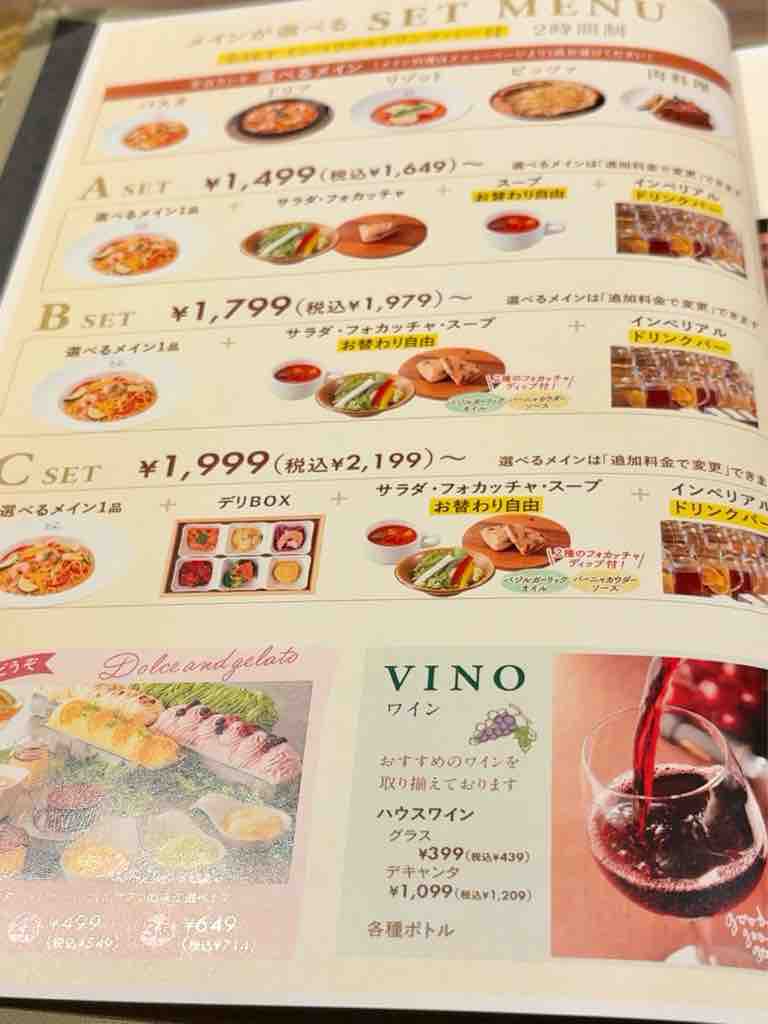 Aセットは、メイン1品、サラダ、フォカッチャ、スープ、ドリンクバーが付いて1699円税込から
