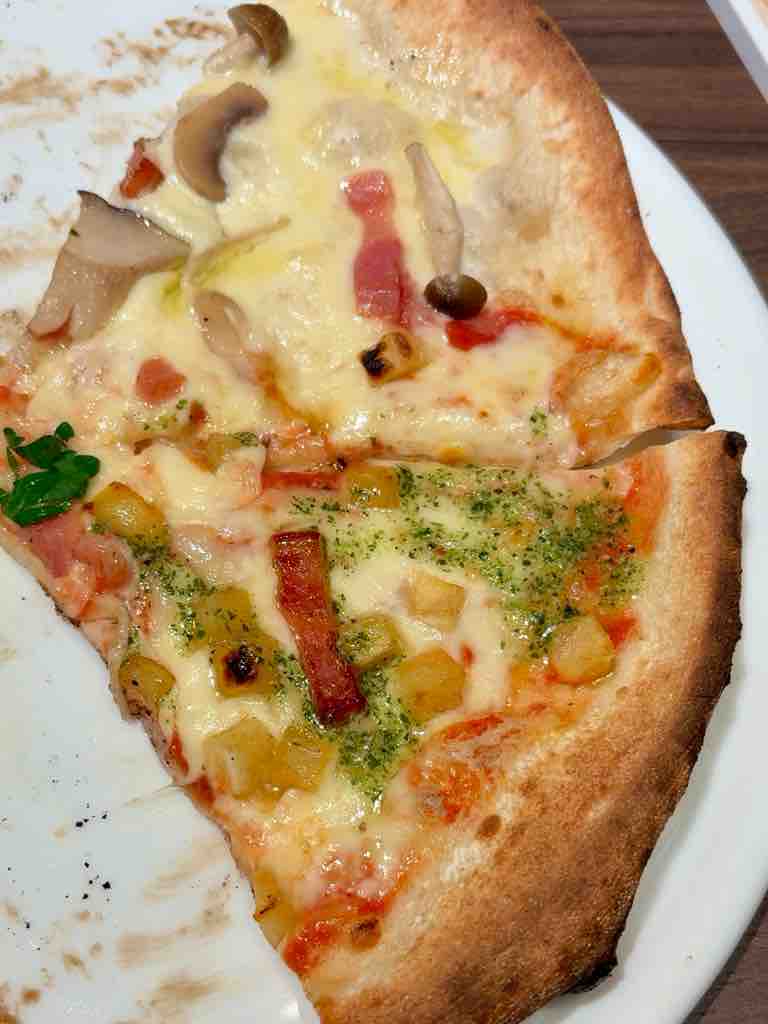 ポテトフライ549円は細身ですがカリッと揚がっていて油切れも良く美味しいですねベーコンとポテト&3種のきのこのフンギピッツァ、Aセットで1979円