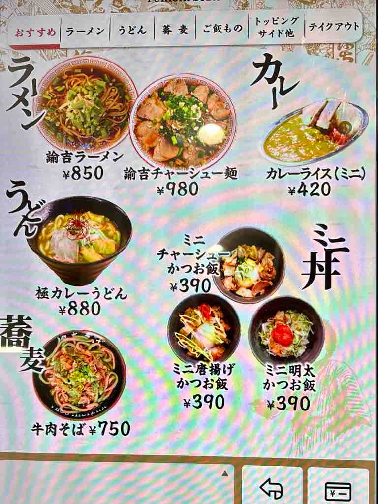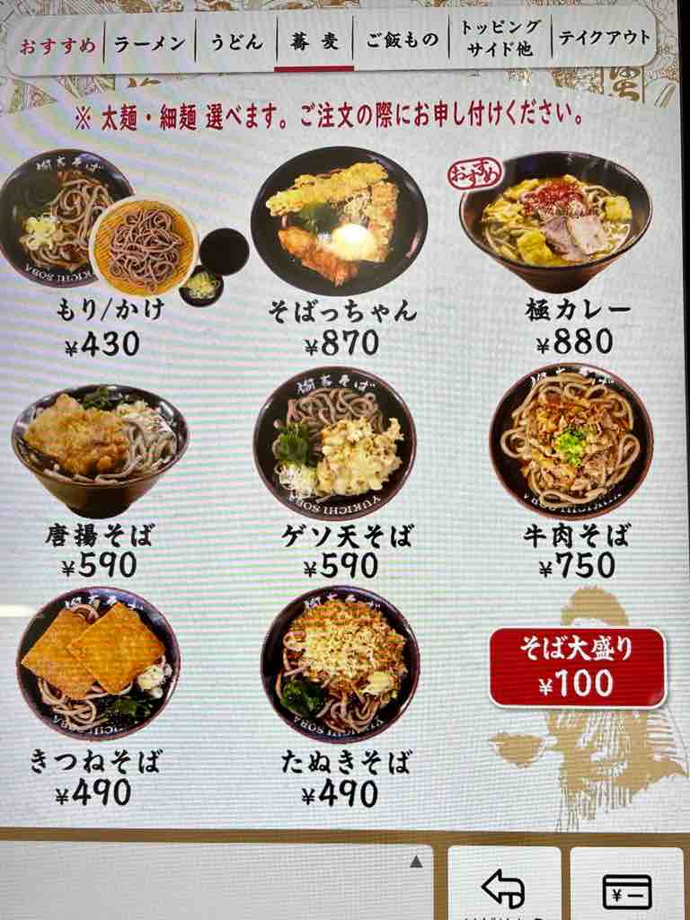 トレーを置いて、うどん、そばを申告、天ぷらは揚げ置きを自分でお皿に取るタイプ
