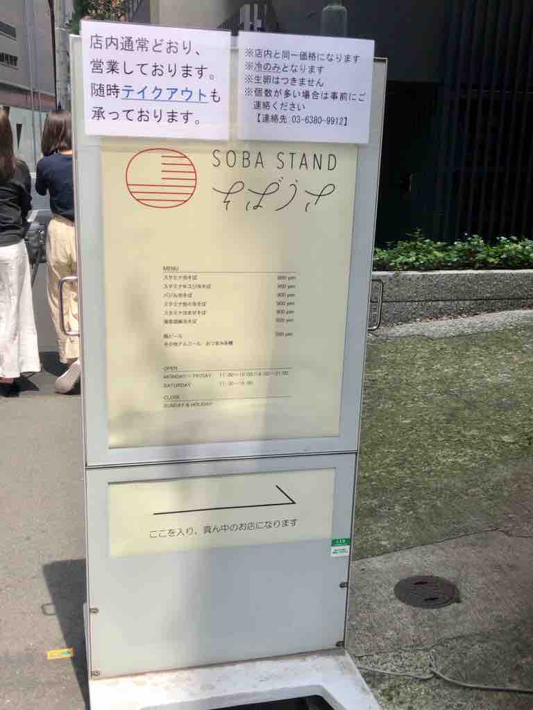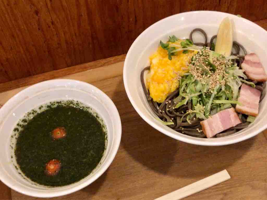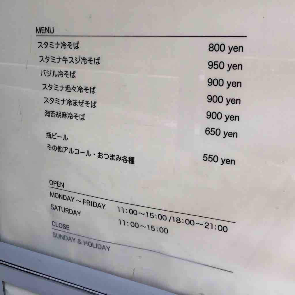 ダークグレーのモダンな外観。相変わらずお洒落ですね。「あさひ」の頃の半蔵門駅通り側の入口は閉じて、平河大神宮に曲がった側からのみの出入りです。入口のオレンジ色の長いビニール暖簾をかき分け、店内に。こちらも昼時ほぼ満席。入口右の券売機で、バジル蕎麦の存在を確認しつつ、スタミナ冷そば 850円をポチり。