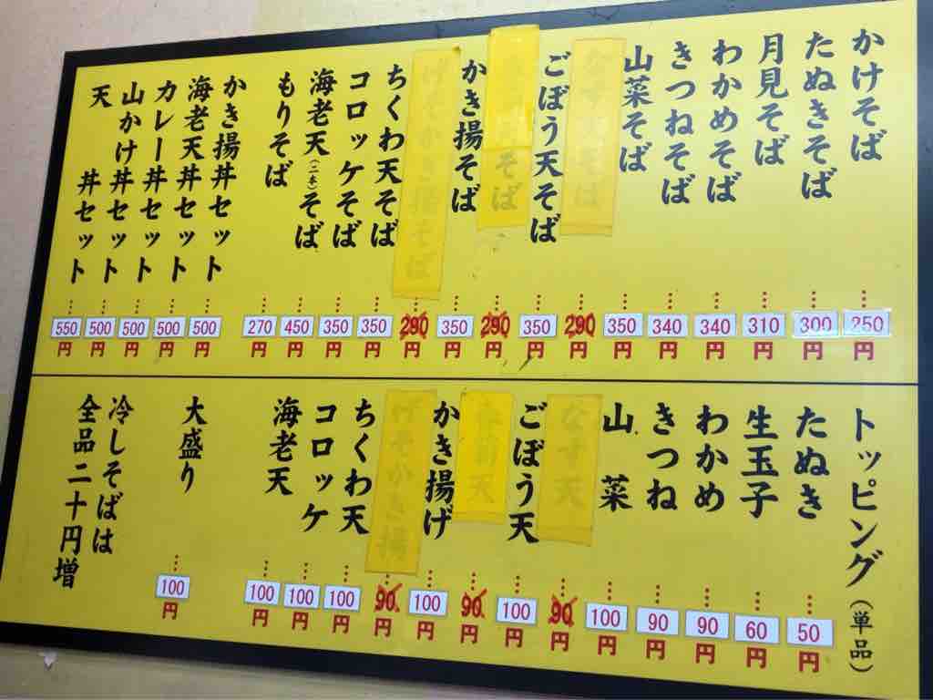 かけそば 200円の看板に5が貼り付けてあって、250円に。