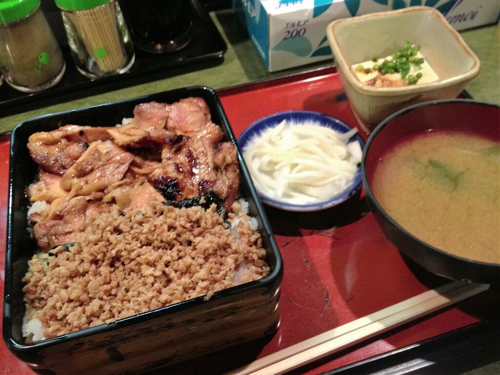 鶏肉が甘辛く絶妙なタレで焼かれたものと、鶏そぼろが半分ずつ。