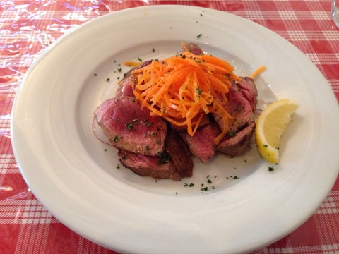 銀のカレー皿のような深型の楕円の皿に入れられて登場。スプーンは、真ん丸型、フォークは干し草用のフォークのような幅広で後ろにグリップがついているタイプ。このフォーク、ちょっと食べ辛いですね。幅広で口に入れにくく、手で回すとエッジが当たりますね。