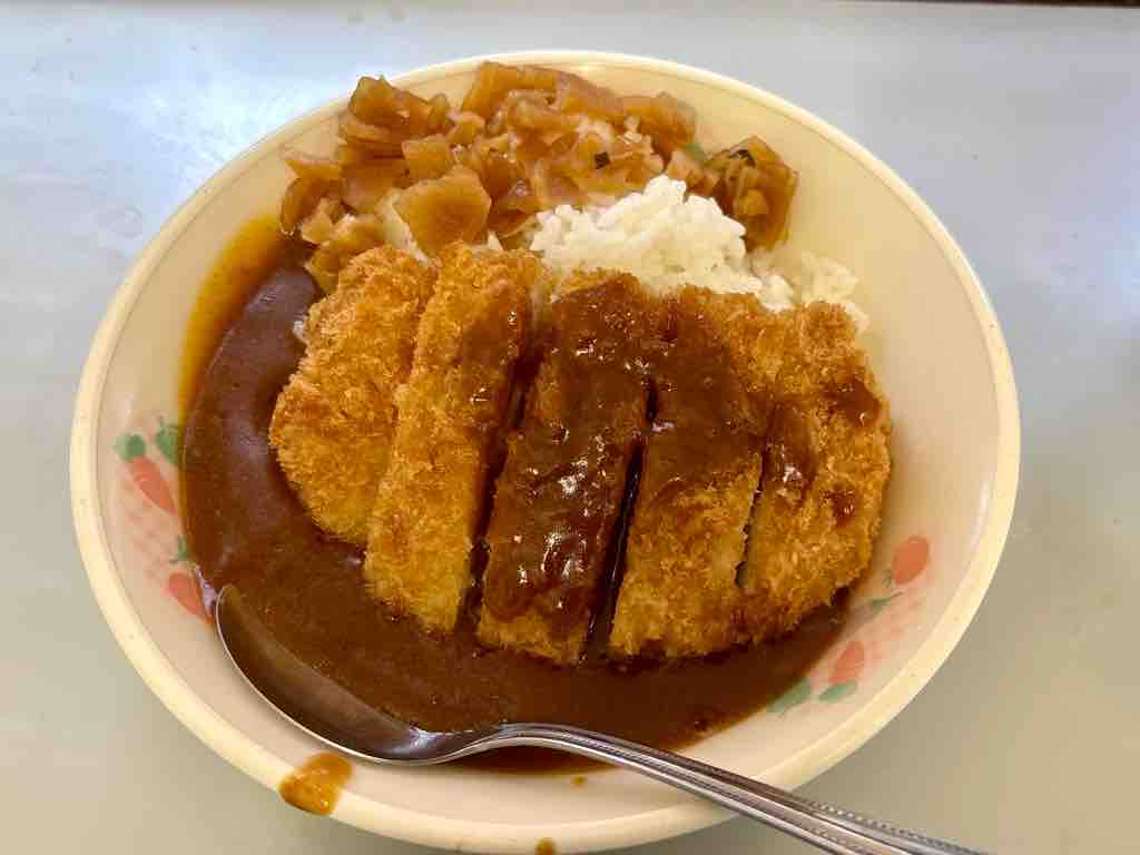 カツカレーはややもったりとした色々溶けてるタイプ、温めてくれたカツは程々の厚さもあり柔らかいですね