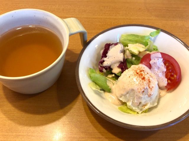 おかわりオーケーのスープとお水をセルフで入れて戻って来れば、ランチサラダが到着。