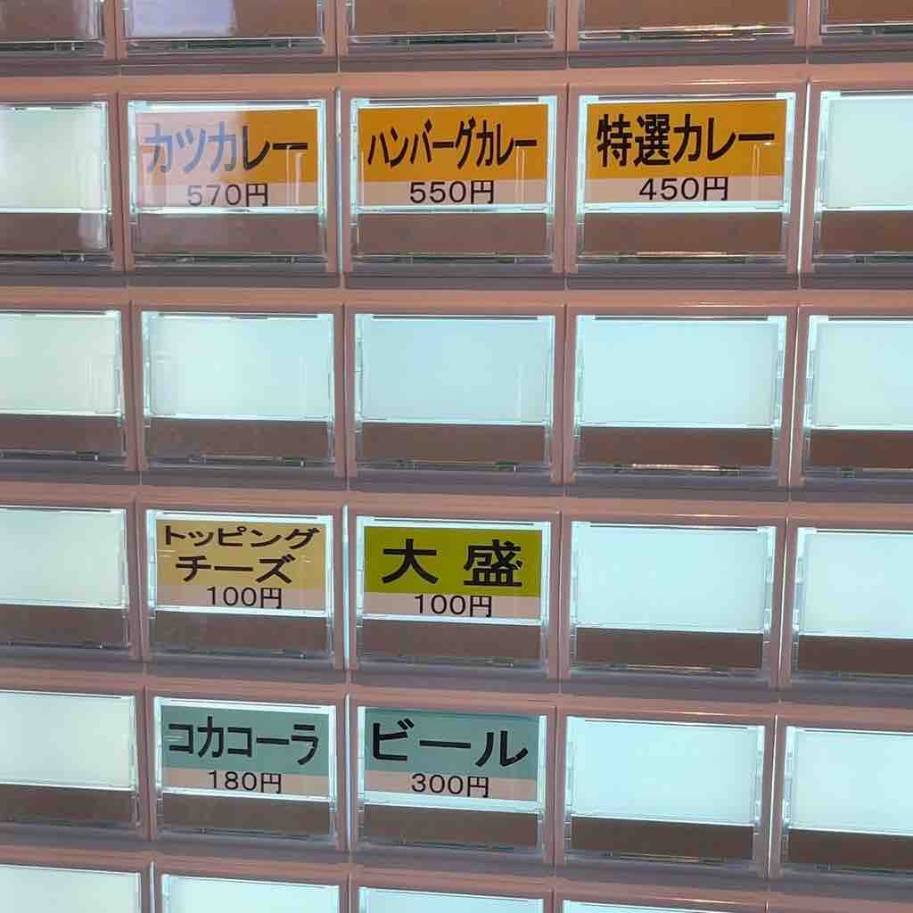 特選カレー、ハンバーグカレー、カツカレーの3品。トッピングのチーズ、大盛、コーラとビールの7つしか稼働してません。チキンはなくなっちゃったのね。