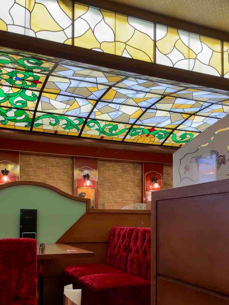 店内は本店同様に、「松本ステインドグラス製作所」のステンドグラス空間が圧巻。昭和レトロな雰囲気で広がります。