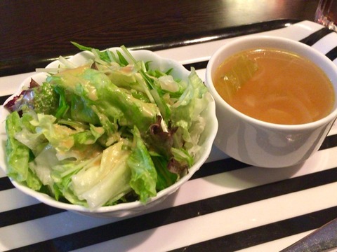 女性客が多いですね、皆さんそれぞれに土曜の午後のティータイムをおしゃべりしながら楽しまれていますさて登場、スープ、サラダ付きで、ソピオの基本形になんとピザ用チーズがデフォで乗ってます