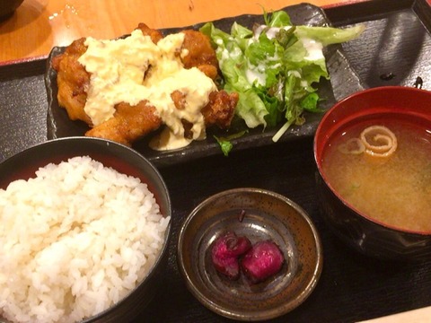 唐揚げ定食、チキン南蛮定食がそれぞれ500円ですよ。迷わず「自家製タルタルのチキン南蛮定食」500円をお願いします。しまった!ご飯少なめ言わなかった。