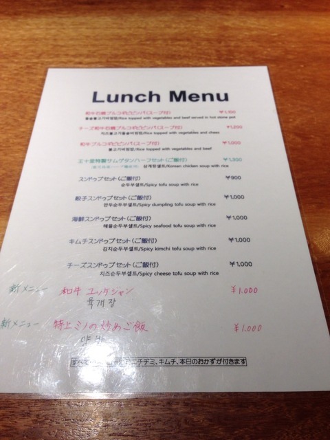 メニューは、ランチは、どれもほぼ1000円。900円のピビンパ、ハーフサイズの参鶏湯1300円。