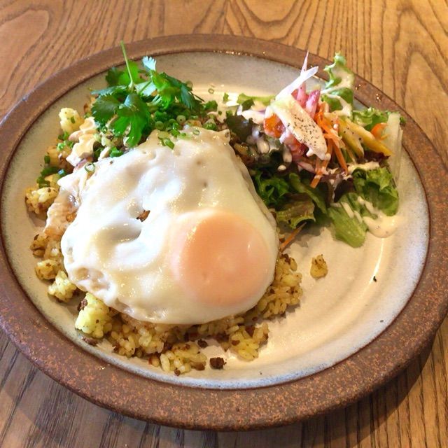 サラダが盛られ、まぜご飯の上には目玉焼きとパクチーが。