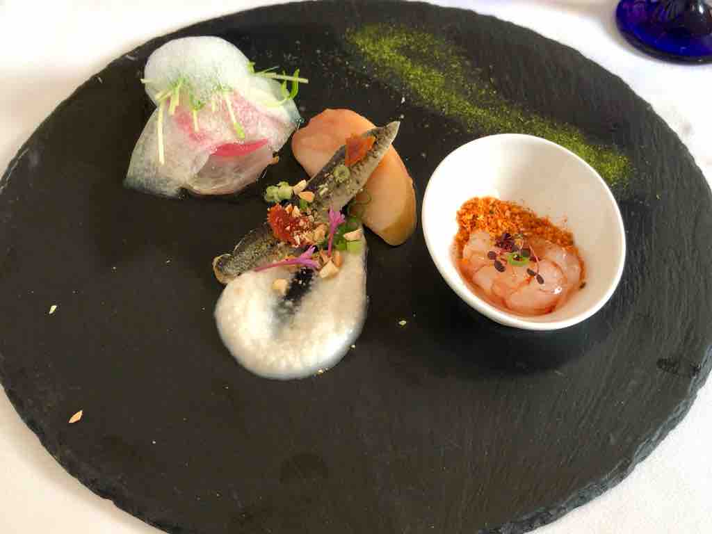 前菜は、カンパチのカルパッチョ柚子エスプーマ、サンマリンゴソテー添え、赤海老のパプリカフレーク。
