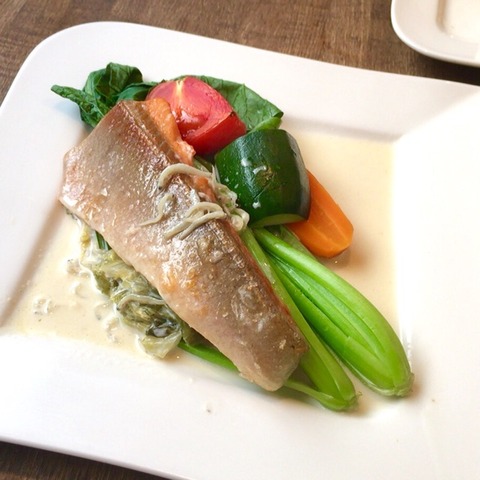 サーモンマリネとサラダのフィユテ:サラダをサーモンマリネで巻いたスペシャリテ。山羊のチーズとパイ。1500円
