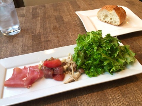 カルトエッセン:ローストビーフ、サーモンマリネ、生ハムなどのオードブル盛合せ、バケット、クロワッサン、フルーツ盛合せ。1500円