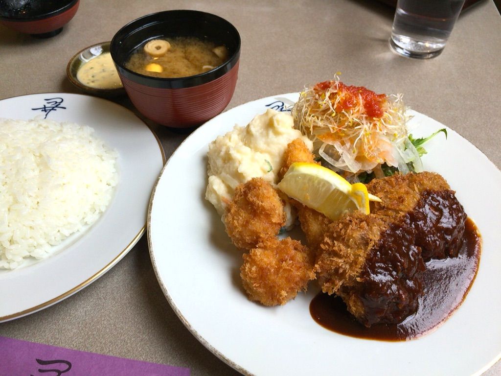 ポークジンジャー系もそそられますが、ここはミックスフライ定食 1600円をご飯半分でお願いします