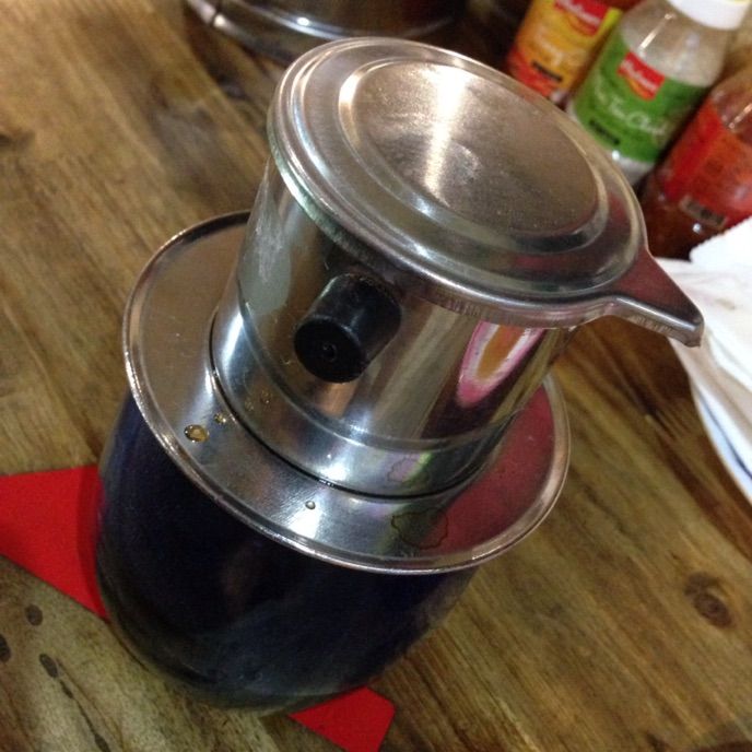 食後には、ホットのベトナムコーヒー。ぽたぽたと抽出されています。下のコップにはあらかじめお砂糖と粉ミルクが入っていますので、自分の加減で静かにかき混ぜれば甘さの調節も可能ですよ。