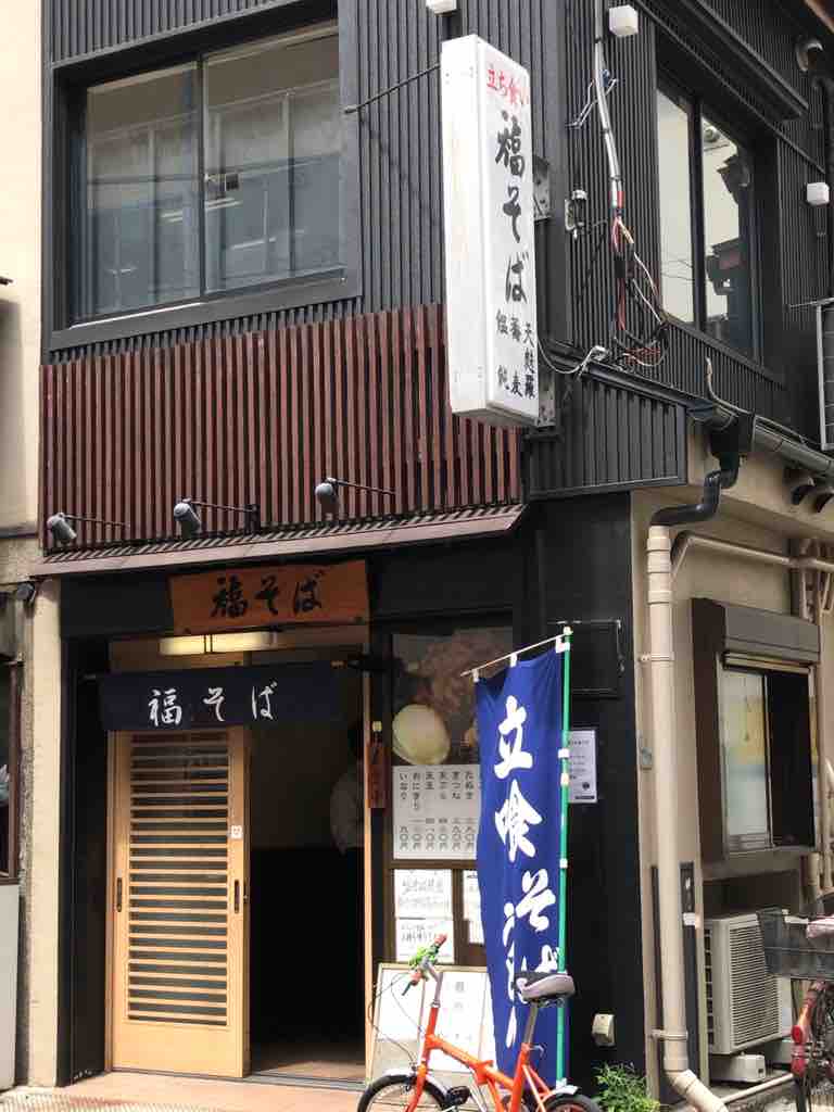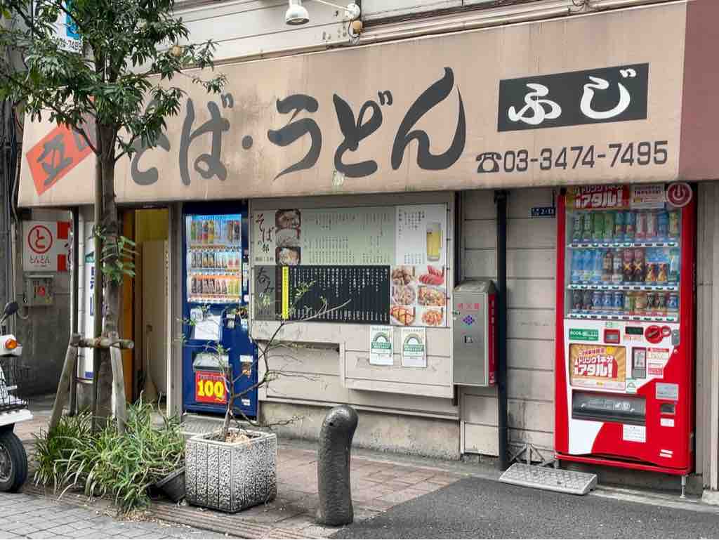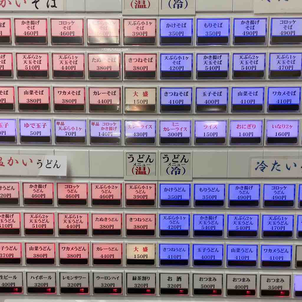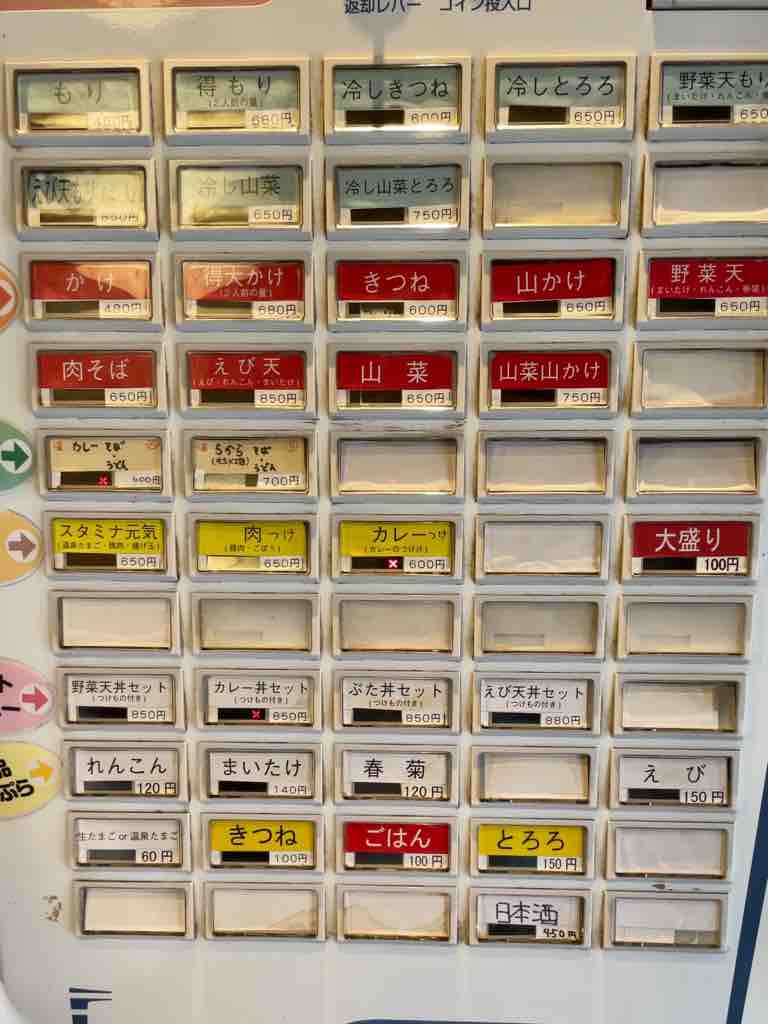 港南口出て真っ直ぐ、駅から2分くらいですかね。駅前に見える富士そばを右手に見ながら昭和感残る雑居ビルの固まったエリアに。2003年のオープンから、朝5時から蕎麦が食べられて、夜は立ち飲みが出来るお店。入口は2箇所。左の入口左側に券売機が2台並びます。