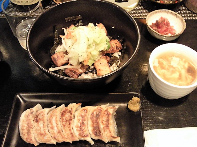 カウンターのみ8席、先客は小学生高学年の子供連れのお母さん。基本の博多ラーメン 750円、麺の硬さは普通で。博多焼き餃子(8個)380円をお願いします。