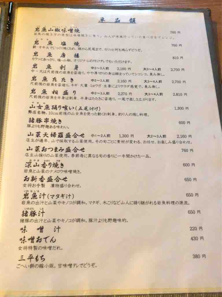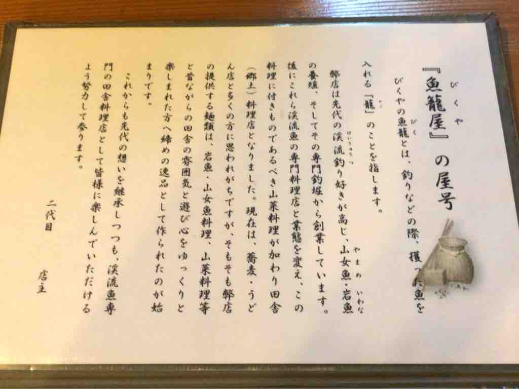 先代が渓流釣りにのめり込み、川魚の養殖などを始め、その後田舎料理のお店にしたとの事で、今は二代目がやってらっしゃいます。