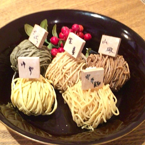 今日の練りこみ麺は、ノーマルの中華麺、ごぼう、ゆず、黄金生姜、四川山椒の5種類。