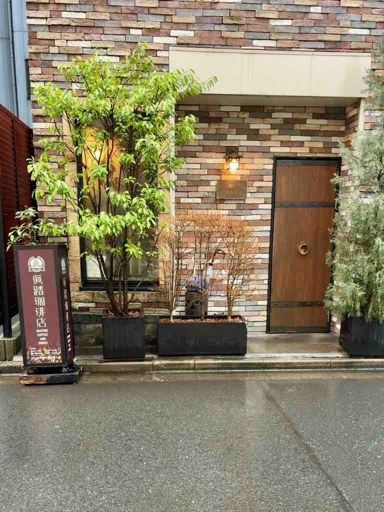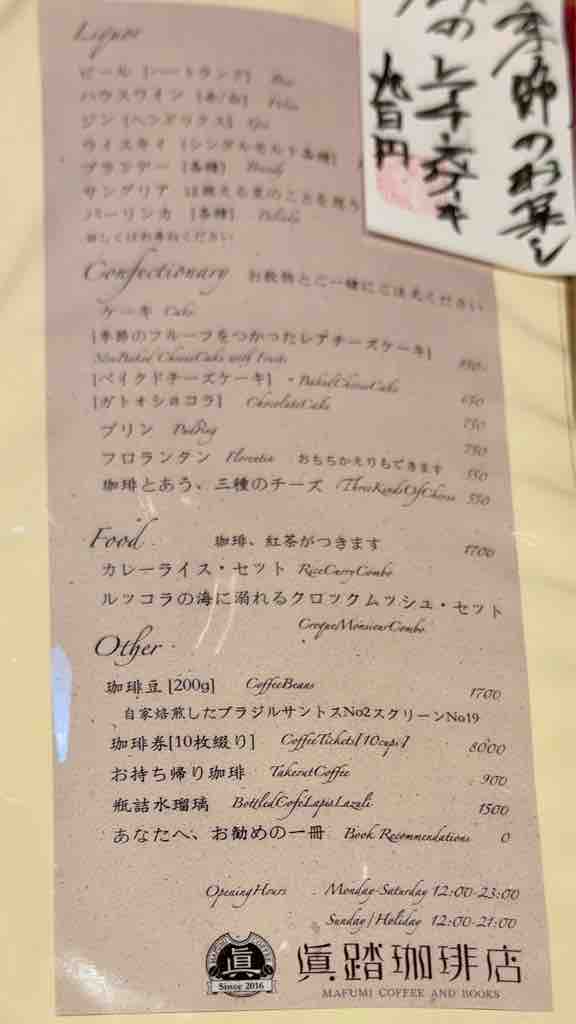 まふみと読む珈琲店、「珈琲と、本と、そして無駄話を楽しむ喫茶店」真ん中に引き手が付いた小さめのドアを開けると右に2階に上がる階段、左に長いカウンターが伸びています、1階か2階か尋ねられるので、1階のカウンターにお邪魔します