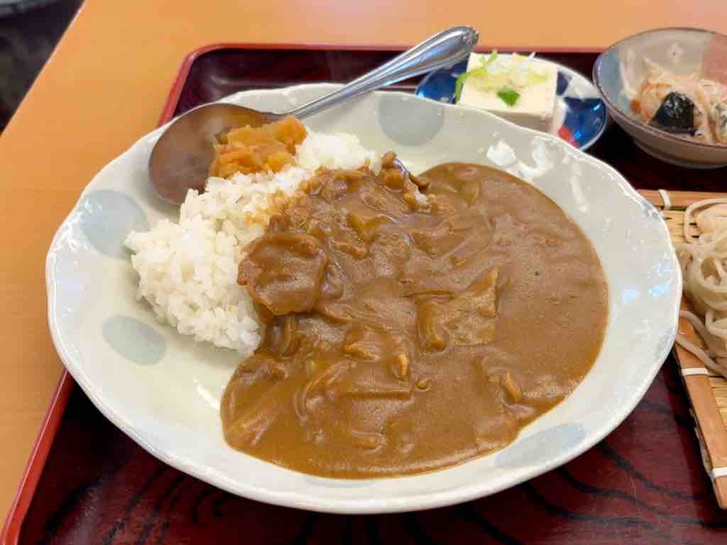 お願いするのは、カレー重そばセット 1200円 ご飯半分でお願いします店内はテーブル席以外に小上がりもあります