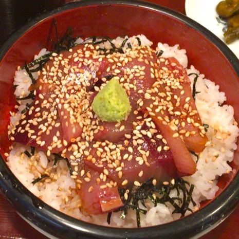 ブリをづけにしてあり、しっかりともりあげられていますね。白ゴマが多めに散らされ、ワサビがピークを飾ります。ご飯の上には切り海苔が敷かれています。