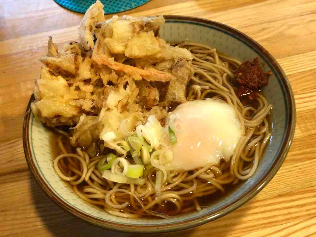 蕎麦で生卵でお願いして、天ぷらは、揚げ置きのケースの中から小さい天ぷらを選びます。
