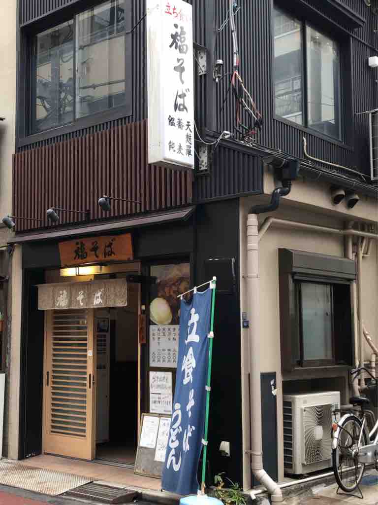 港南口出て真っ直ぐ、駅から2分くらいですかね。駅前に見える富士そばを右手に見ながら昭和感残る雑居ビルの固まったエリアに。2003年のオープンから、朝5時から蕎麦が食べられて、夜は立ち飲みが出来るお店。入口は2箇所。左の入口左側に券売機が2台並びます。