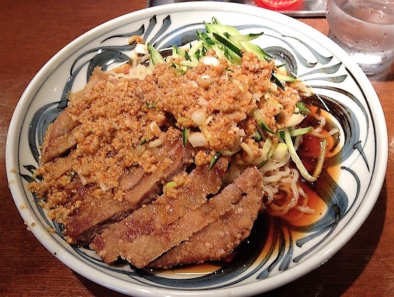 中華丼の上に切った排骨が載っています