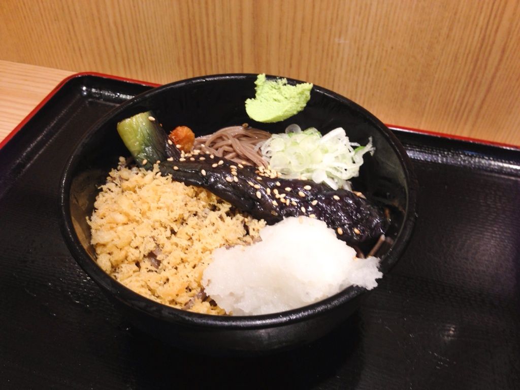 揚げ茄子、おろし、オクラ、鰹節とトッピングも充実。揚げ茄子にはおろし生姜も添えられて。カウンターにあるネギを自分の好みで入れられます。