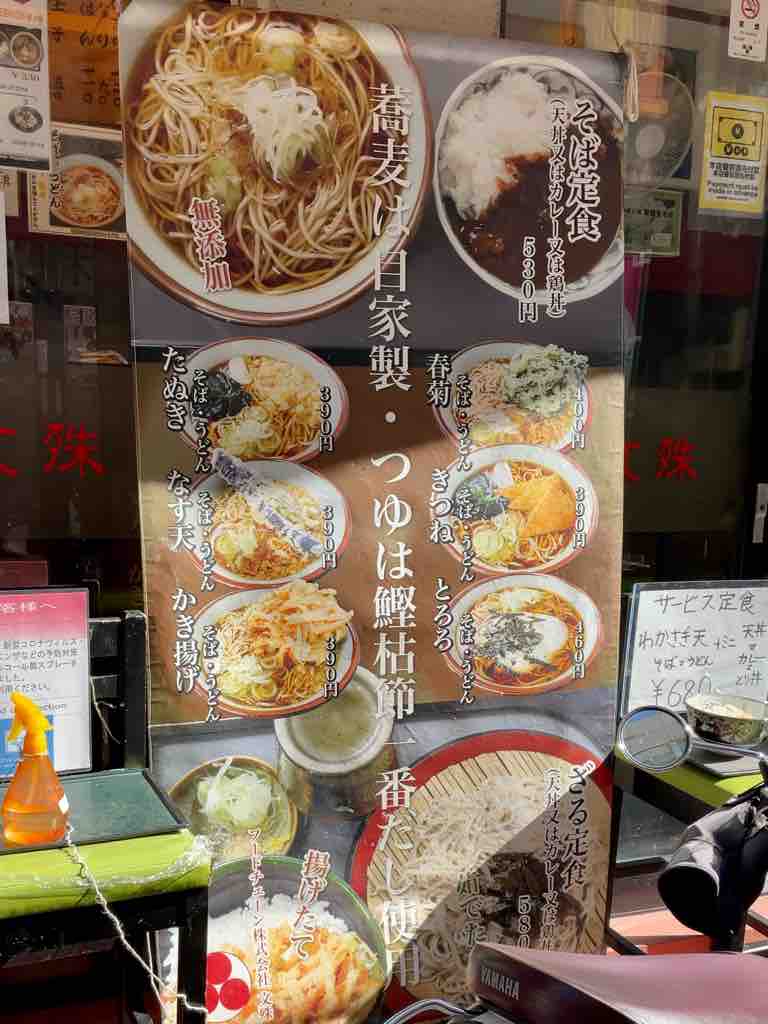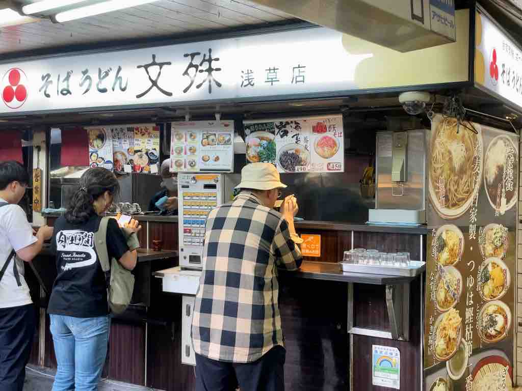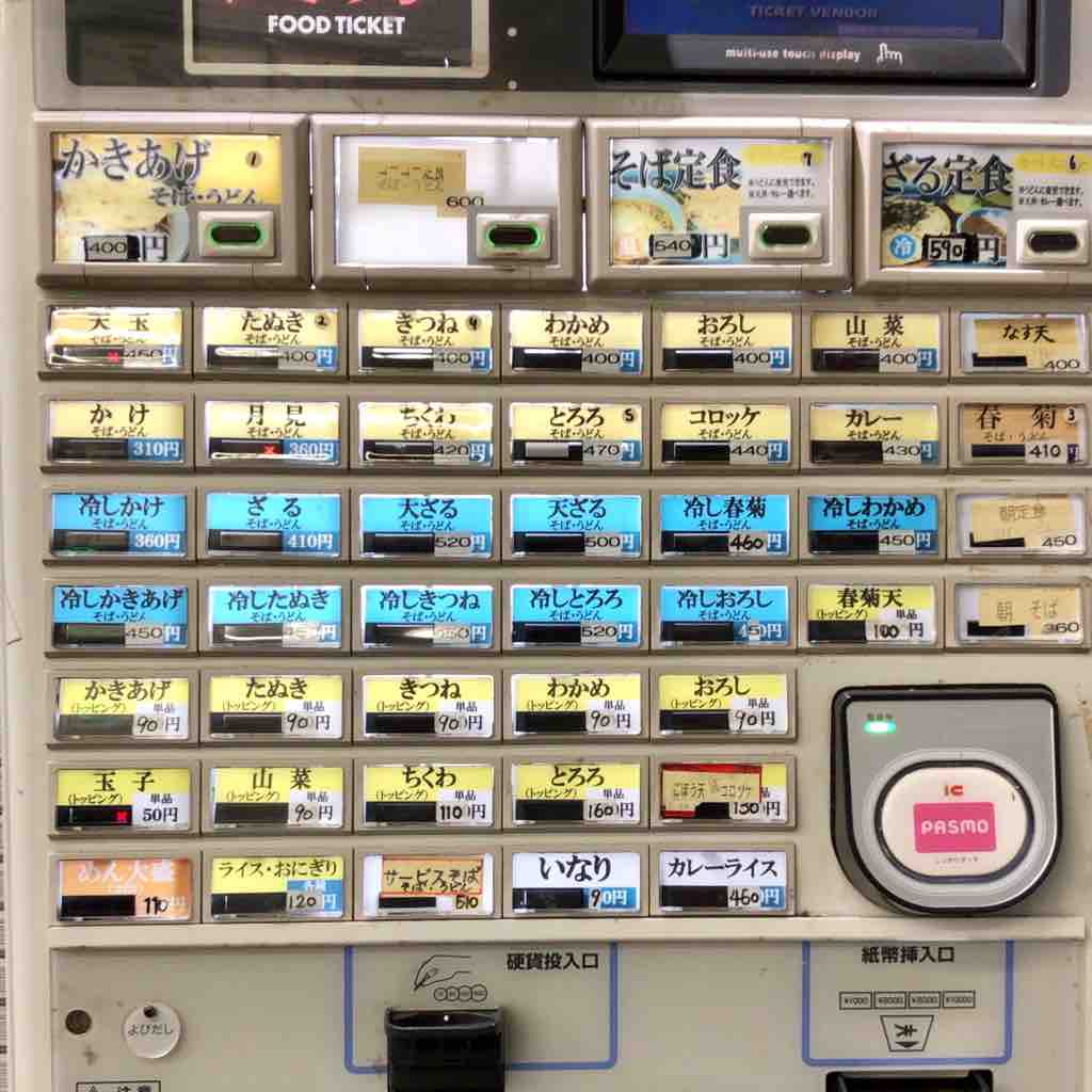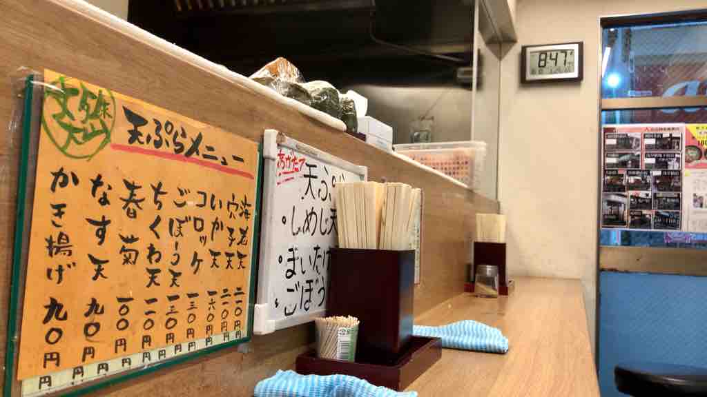 都営地下鉄改札外脇にあるお店。先客はは、5名とやや混雑、後客も3名とどんどん回転します。表の券売機で、春菊天 450円、温玉 80円をポチり。