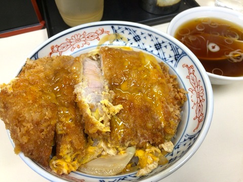 先に揚げてあったカツを切って行きます、縦に半分にしてから小分けに切って、ご飯と千切りキャベツの上に乗せて、カレーをかけてカウンターの上に置かれます