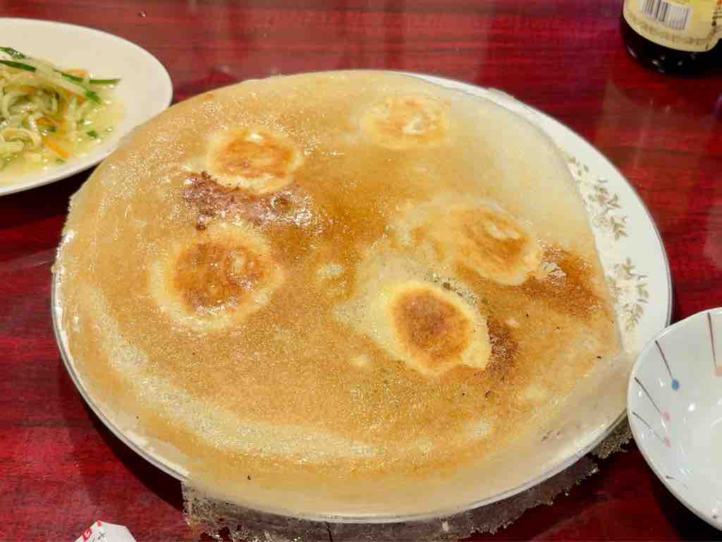 大きなお皿で焼き餃子の登場、味が付いてますからそのままで、好みで黒酢をつけてもとの事です
