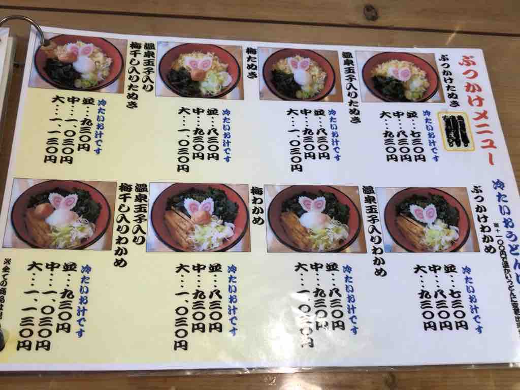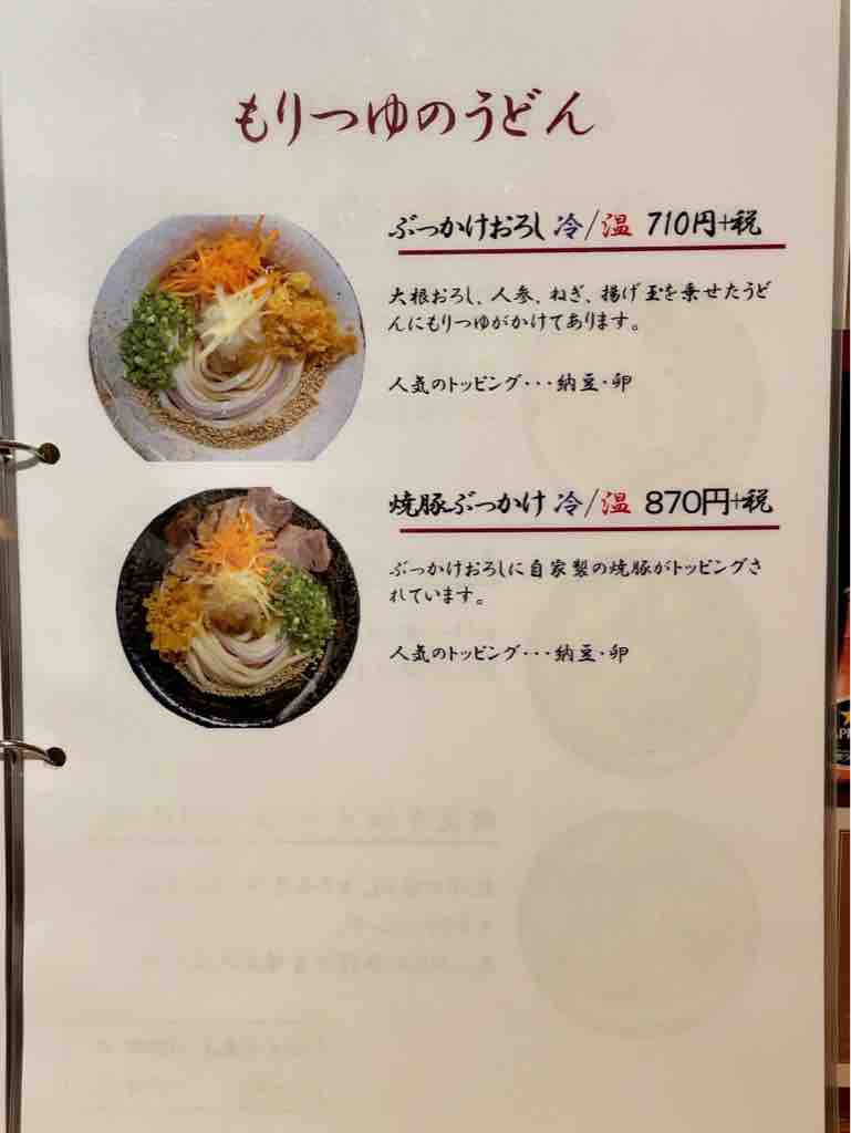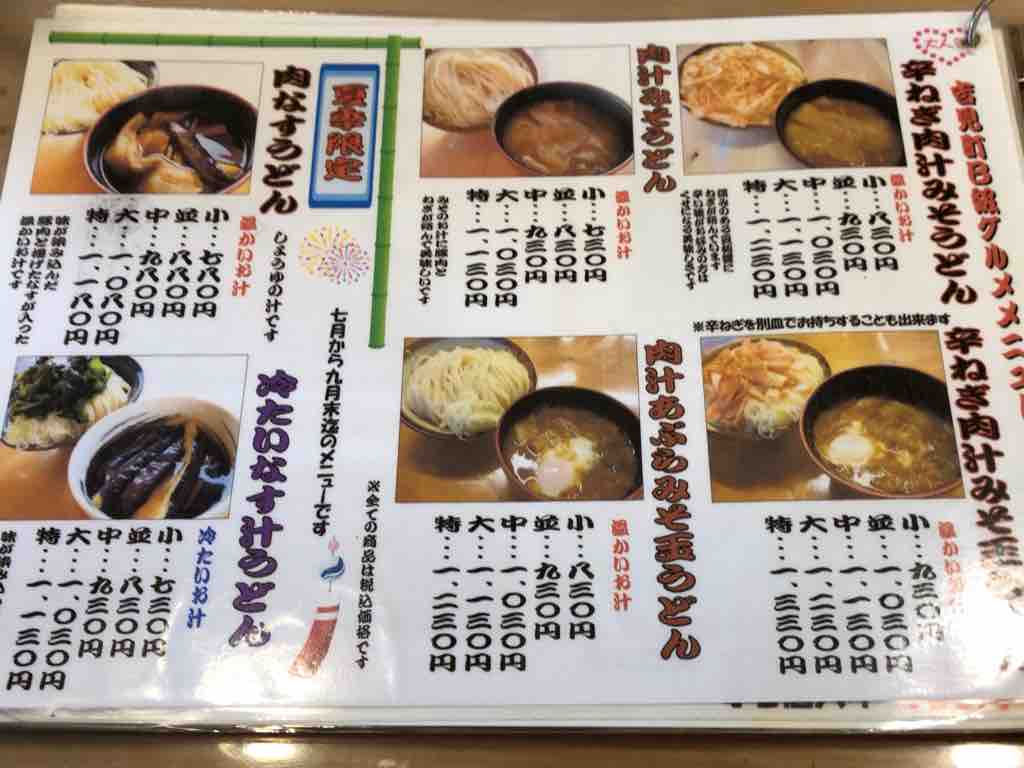 店内両側にハイカウンター席が9席、2人テーブル3つというこぢんまりとして、立ち食いそば店ライクな店構え。温かいうどんは、キャベツのと牛肉の吉田うどんの他にも、つけ汁が武蔵野うどんの醤油味で豚肉の肉汁うどんもあります。奥さんが丁寧につゆの違いなどを説明してくれます。カレーやカツ、平日限定でホルモンや肉玉あんかけもありますね。焼きうどんもあります。ちょっと想像つかないw冷しも当然。富士吉田市では温かいのと冷たいのを一緒に注文するとか。