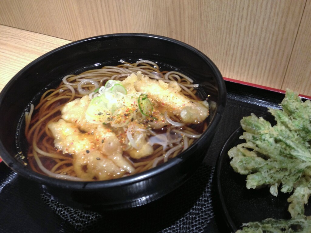 春菊天は、みっしりと刻みがまとめられてカリカリに揚がっています。直ぐには解けません。苦味もほんのりとあって美味しいですね。こう言う立ち食い蕎麦が良いですね。