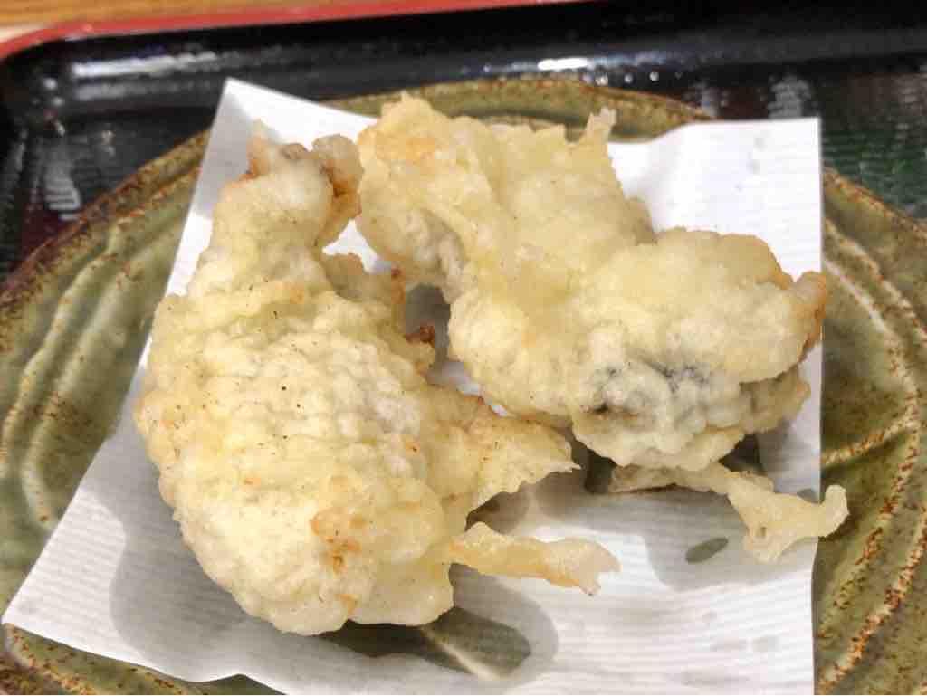お渡し場の横に幾つも七味唐辛子が用意されていて、席でご利用くださいとの事四角いざるにこんもりと盛られた蕎麦は200gだそうです、見た目すごい盛りですがざるが山型になって水切りが良くなるタイプ器に牡蠣の天ぷらがゴロゴロと入っています、2つに切って揚げてあるようです