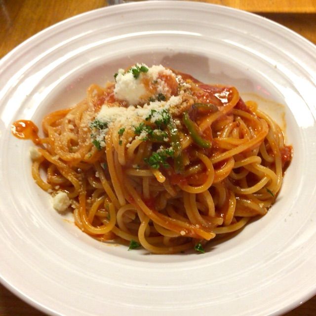 パスタは生なのでモチモチとしていて美味しいですね。喫茶店のナポリタンとも、洋食屋さんのナポリタンとも違う、茹で置きでもアルデンテでも無い、面白い感覚。